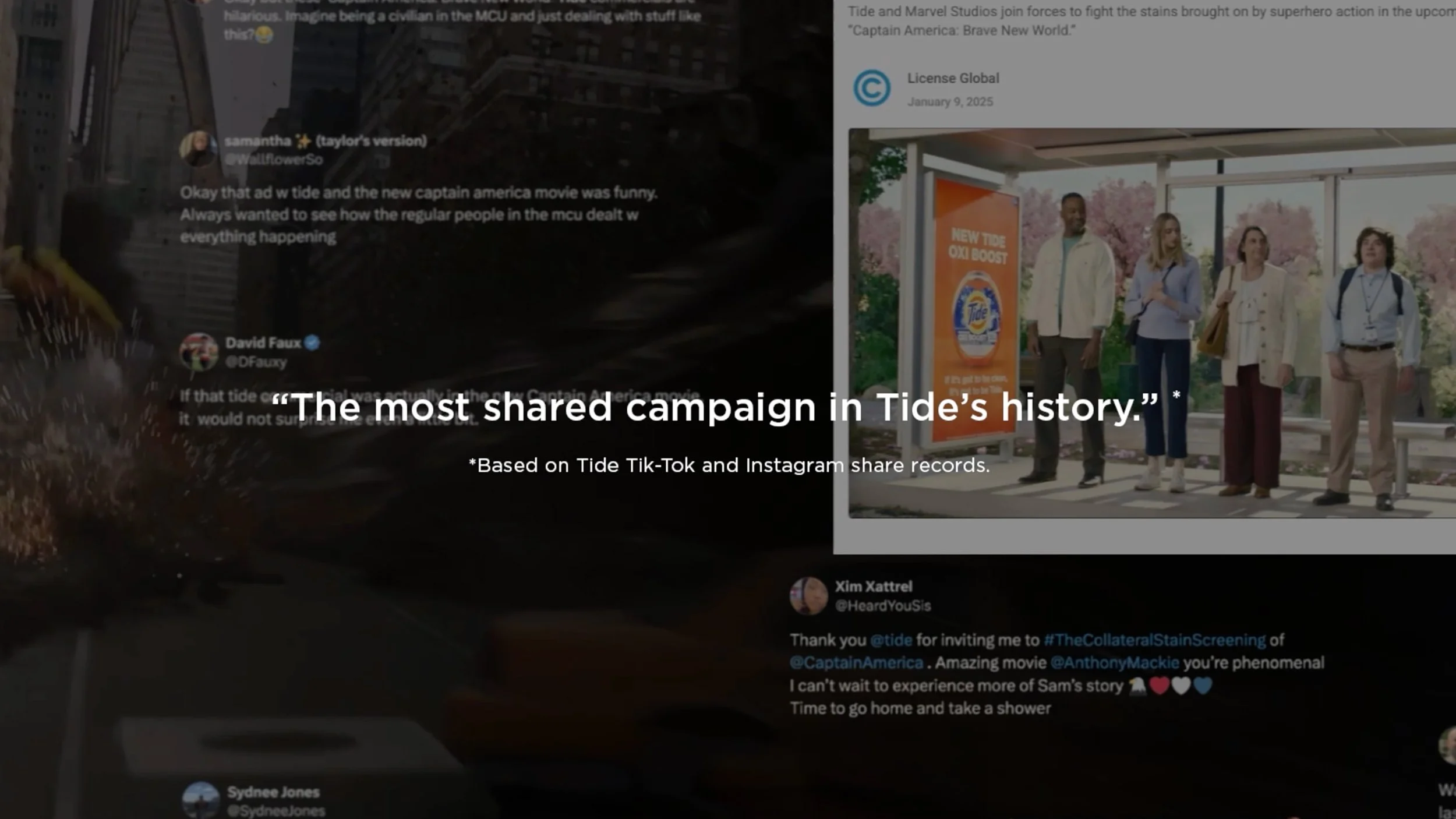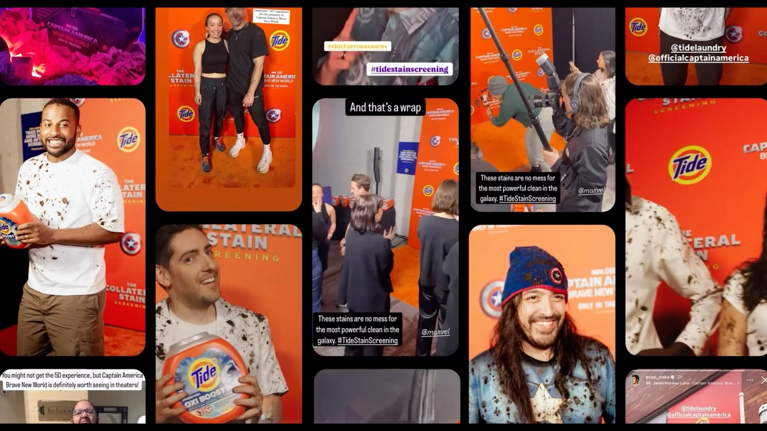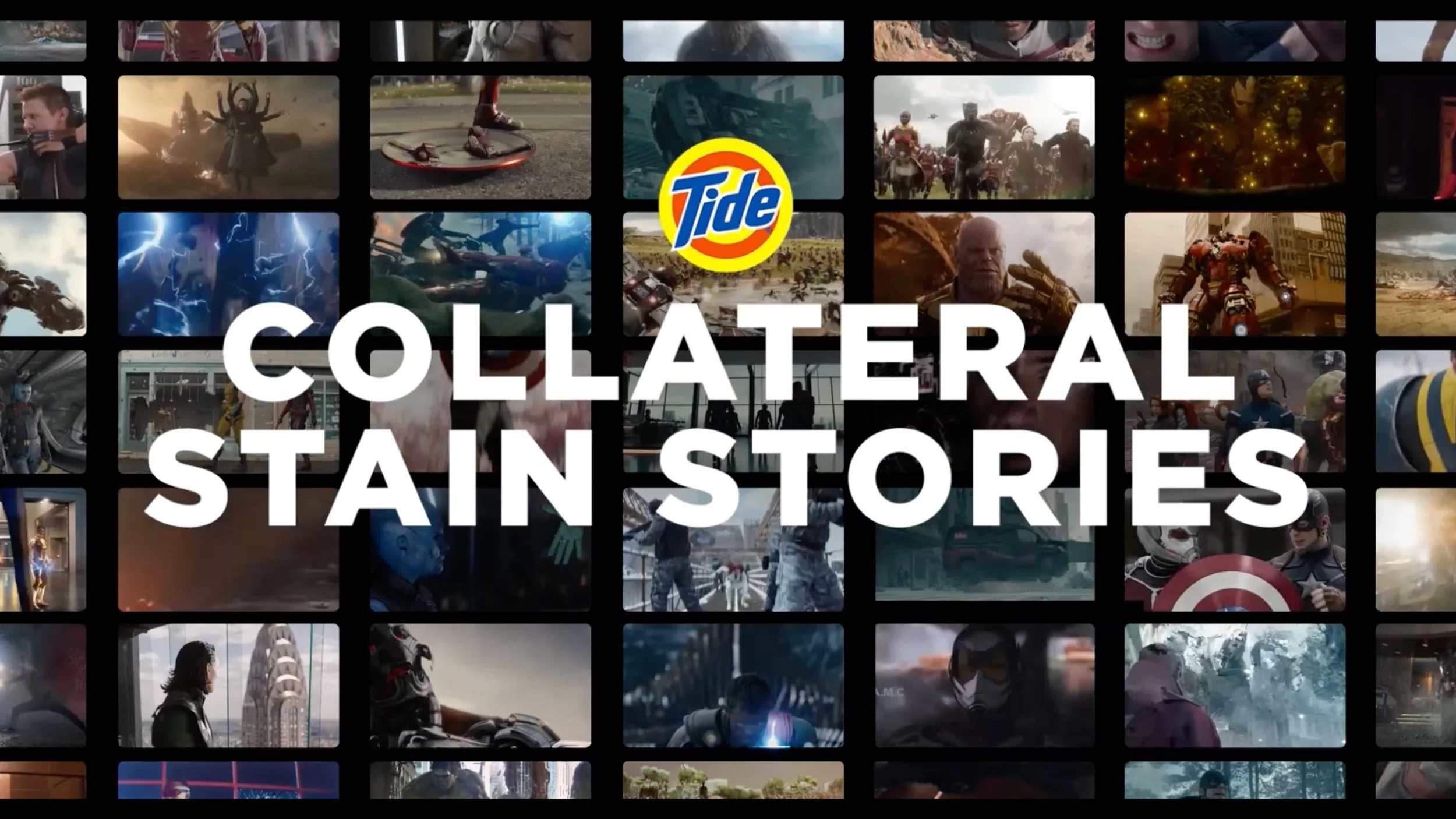 Rather than tell the story of the heroes you know, Tide turned the camera around to focus on the regular people who live in the Marvel Universe and have to clean the messes, and stains, the heroes leave behind. Partnering with Marvel, Tide went through all 36 films and ten TV series to identify every single collateral stain victim. Tide told their collateral stain stories from TV to TikTok, outdoor to OLV, and they treated the launch of the campaign like the launch of a Marvel movie, from sending the talent to the red carpet, turning them into action figures, even creating their own screening where fans could experience all the action — and stains — that happen in the Marvel Universe.